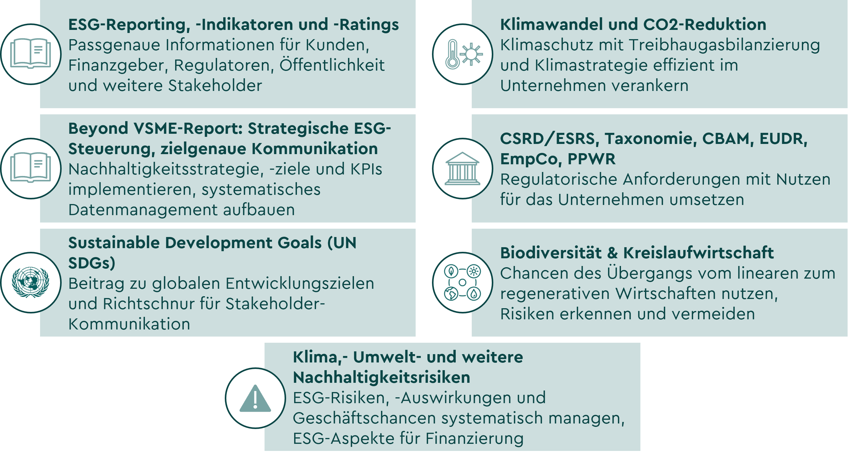 - Beratende Unterstützung bei der Einführung und Weiterentwicklung von Strategien und Prozessen für das Nachhaltigkeitsmanagement